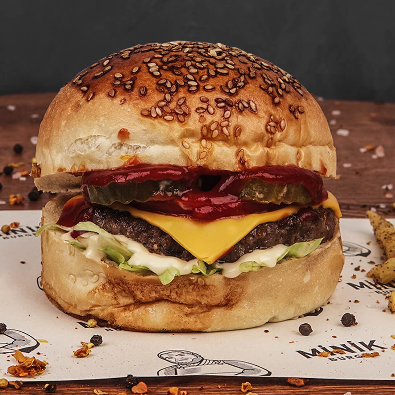 Hamburger Köftesi - Cheddar Peyniri - Domates - Marul - Turşu - Ketçap - Mayonez. Patates Kızartması ile
